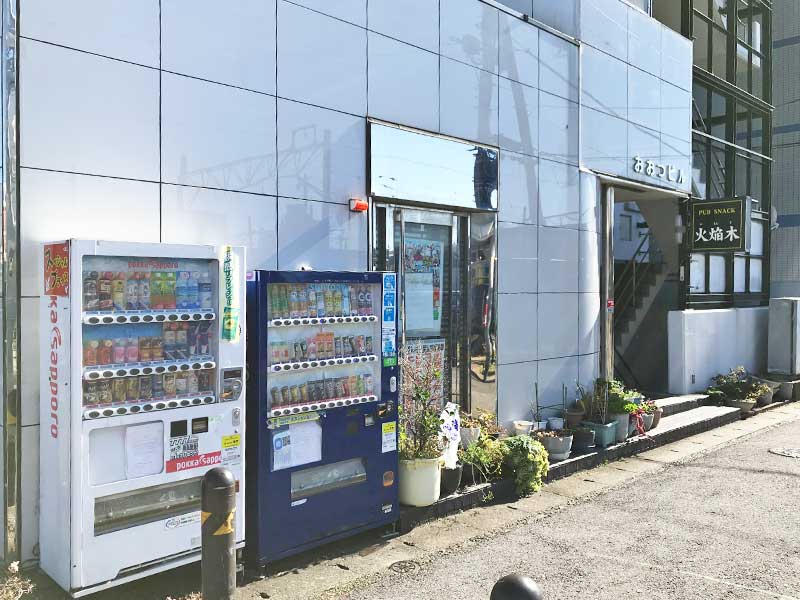 建物の壁際に自動販売機があり、その横に入口がありますので、そちらから当事務所がある5階までお越しください。
